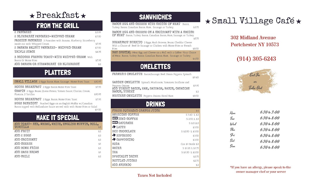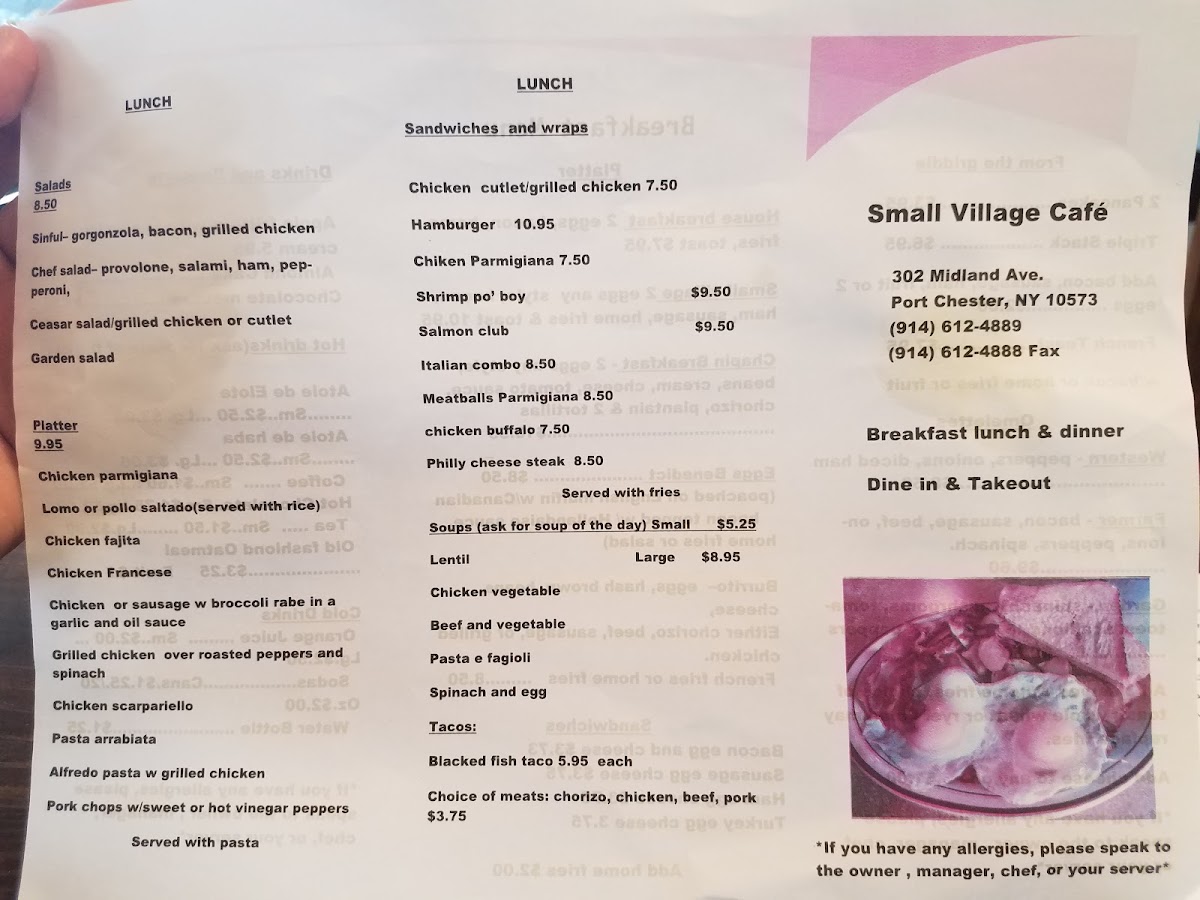 Welcome to Small Village Cafe, a delightful eatery nestled in Port Chester, NY. This cozy spot offers a menu that blends comfort with taste, highlighting fresh and wholesome ingredients. From delicious breakfast options to hearty dinners, each dish is crafted with care. Customers rave about the California omelette and bacon, egg, and cheese, both perfect for starting your day right. The California dinner salad, with its perfectly sautéed veggies, showcases the café's commitment to healthy eating.